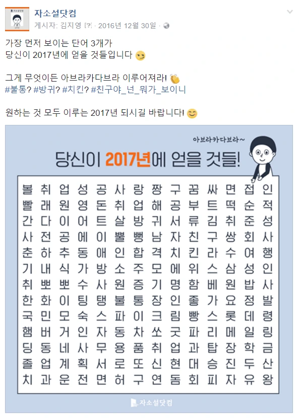 위의 컨텐츠 포멧은 참여가 매우 쉬워서 다른 페이지들에서도 많이 제작하는 컨텐츠 유형이었다. 여기에 연말이라는 시즌의 특징, 취업 준비생들의 눈길을 끌만한 단어들, 그리고 재미 요소를 조금 더해서 컨텐츠를 제작했다.
