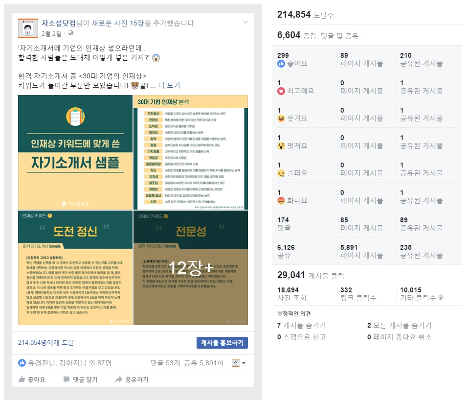 결과는 6천 건 이상 공유, 21만명에게 도달이 되었다. 이것도 '이 정도로' 터질 줄은 몰랐다. 하지만 '자기소개서 쓸 때 인재상을 반영할 수 있을까?' 라는 취업 준비생들의 고민을 터치했기 때문에 잘 될 수 있었다고 생각한다.