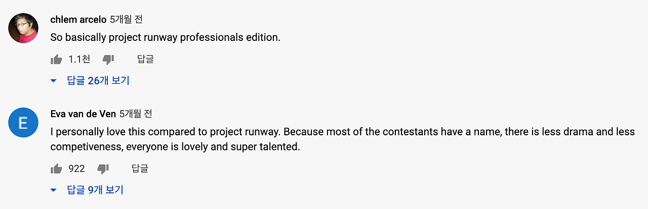 네티즌들의 댓글을 보면 비슷한 생각을 가진 사람들이 많았나 봐요. 프로젝트 런웨이의 업그레이드 버전 아니냐는 말들이 있더라구요 ㅎㅎ