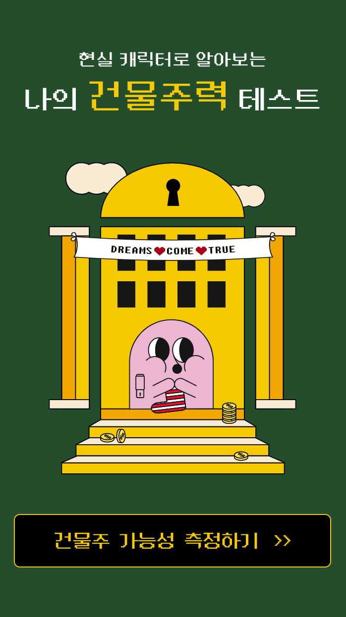 얼마 전에 ‘건물주 테스트'라는 것을 만들었어요. 금융권에서는 주식 투자나 펀드 가입을 위해서 무조건 투자 성향 테스트를 해야 하는데요, 실제로 보면 무슨 말이지 모르는 경우가 많고, 재미도 없습니다.