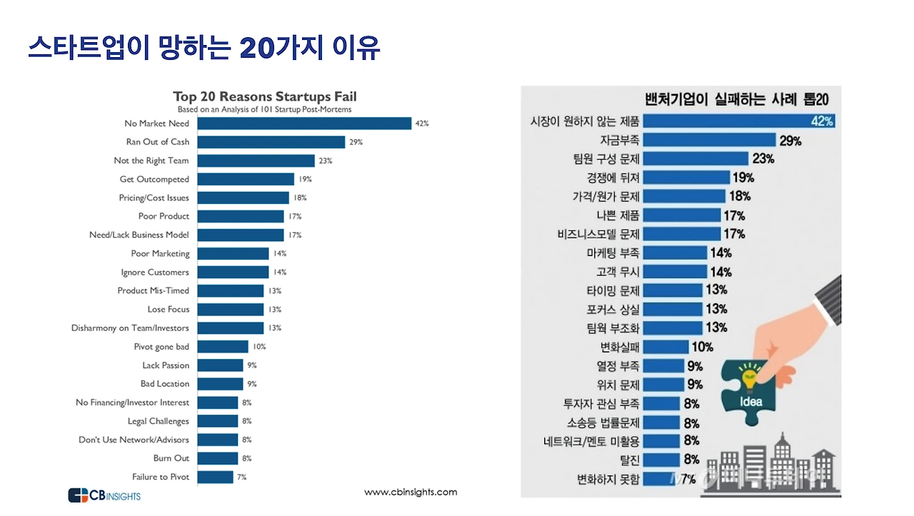 “스타트업이 망하는 20가지 이유”라는 유명한 조사가 있습니다. 많은 스타트업 대표님께서 개인의 니즈를 기반으로 제품을 개발하지만, 대중이 정말 필요로 하는가에 대한 리서치와 벤치마킹이 선행되지 않아서 스타트업이 망하는 경우가 많다고 해요.