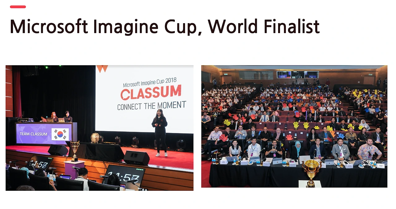 “국내뿐만 아니라 해외에서도 가능성을 입증할 수 있지 않을까?” “대학뿐 아니라 중고등학교, 기업, 협회 등 다른 조직에서도 작동하지 않을까?”라는 질문을 던지며, 경진 대회를 통해 해외 대학, 기업, 협회 등 교육기관에 적용해 보았습니다. 그 결과, 클라썸은 다양한 시장 가능성을 입증하였고 ‘마이크로소프트 이매진 컵’이라는 세계 유명 SW 경진대회에서 한국 대표, 아시아-태평양 지역 대표로 선발되어 World Finalist에 선정되는 등 연달아 입상하였습니다.