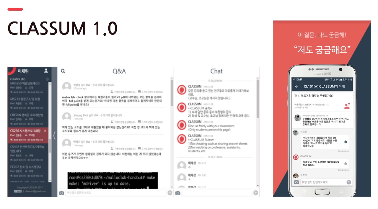 카톡방에 참여한 학생들로부터 매우 긍정적인 평들이 이어졌지만 단톡방의 특성상 일부 불편한 점들이 있었습니다. 이를 개선하기 위해 클라썸은 커뮤니티 앱 형식의 서비스 플랫폼을 개발하였습니다.