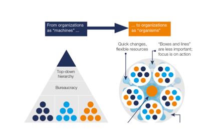 지금보다 더 큰 도전을 위해 여러 가지 시도를 하고 있습니다. 그중 사고의 전환을 위한 노력을 하는데요. 위 그림에서 보시는 것처럼 작년까지는 첫 번째 사진의 왼쪽 구조로 의사소통을 했습니다. 대표인 제가 결정을 하면 팀이 일사불란하게 움직이는 구조입니다. 일반적인 회사의 구조이죠.