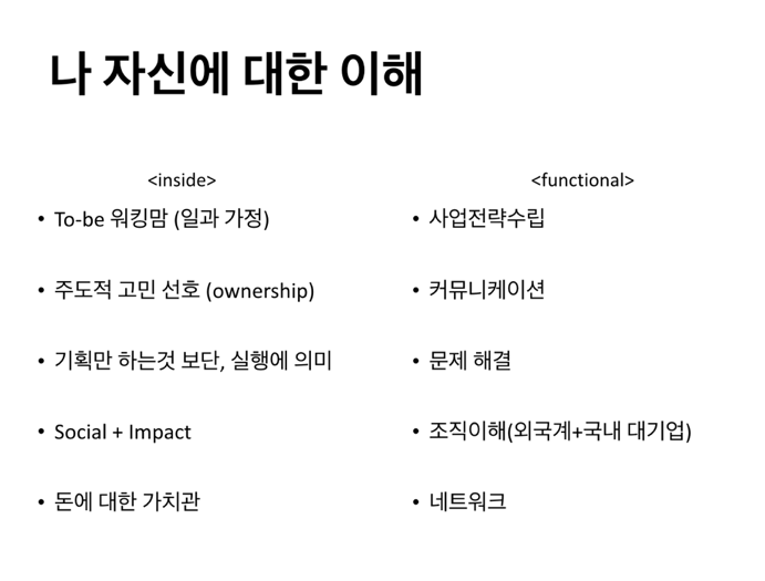 만약 내 딸도 30년 후에 나와 동일한 고민을 하고 있다는 생각하니 가만히 앉아 있을 수가 없었습니다. 내가 할 수 있는 건 무엇이고, 이 일을 할 수 있는 사람인지에 대한 ‘나 자신에 대한 이해’ 분석을 시작했습니다. 아래는 사업에 필요한 것들과 제가 잘하고 부족한 부분들을 분석하여 정리한 내용들입니다.
