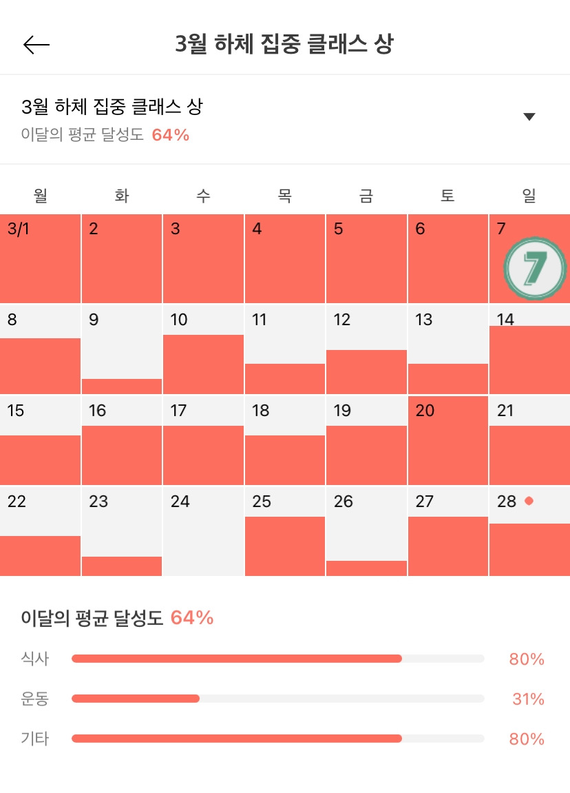 2월까지 거의 80% 육박할 정도로 운동과 식사 기록을 잘하고 있었는데, 그래서 3월 첫 째 주에는 7일 연속 인증까지도 성공했는데!!