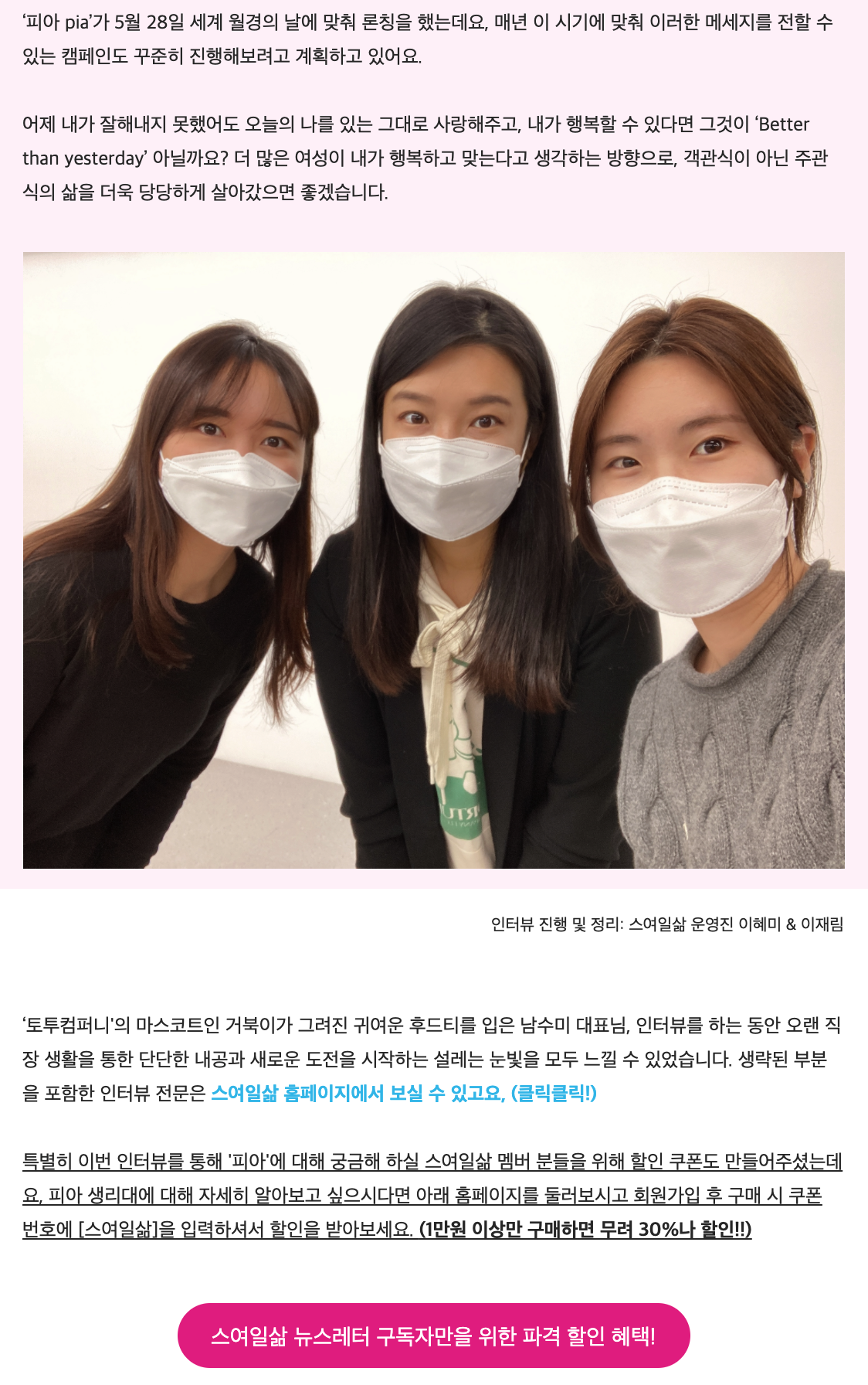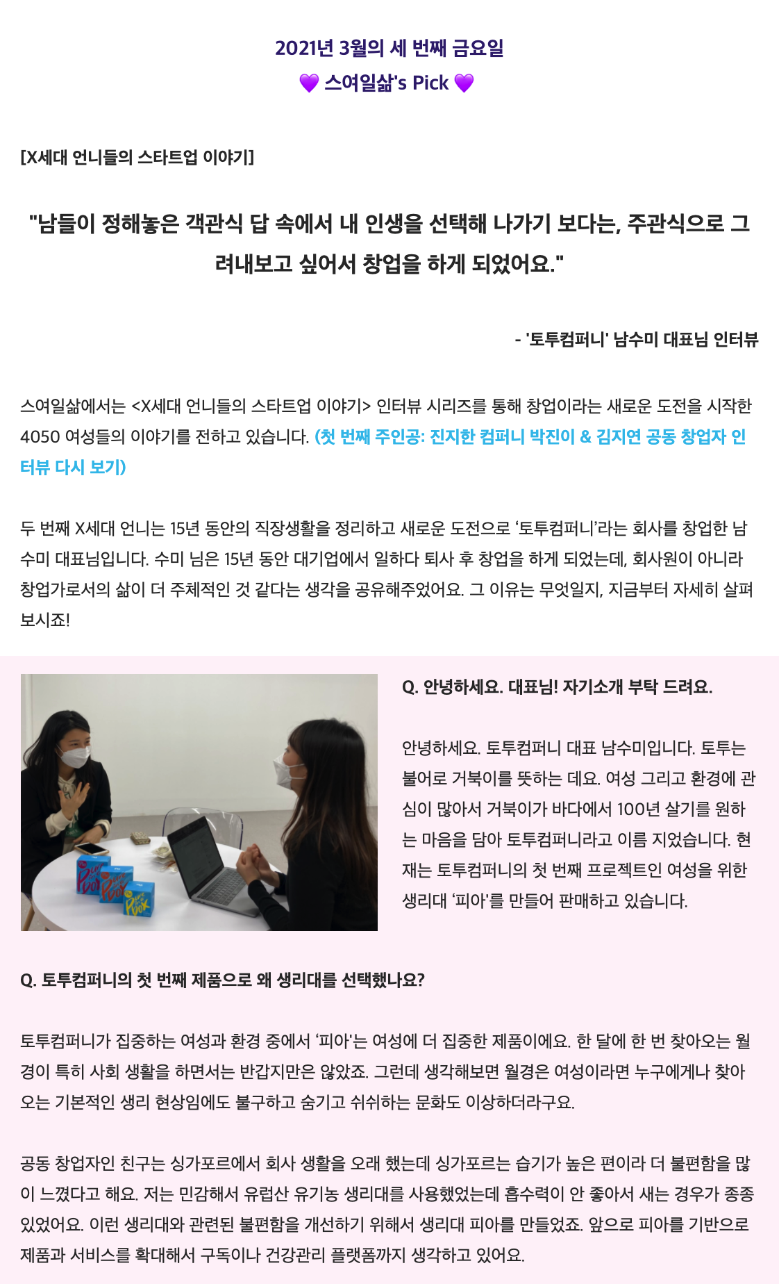 3월에는 운영진 아정님, 서인님과 함께 벤처스퀘어 인터뷰도 했다. 매번 나 혼자 인터뷰를 하다가 같이 하니 좀 더 든든하고 앞으로 어떻게 커뮤니티를 꾸려갈지에 대한 고민도 더 깊게 해보게 되는 계기가 되었다.