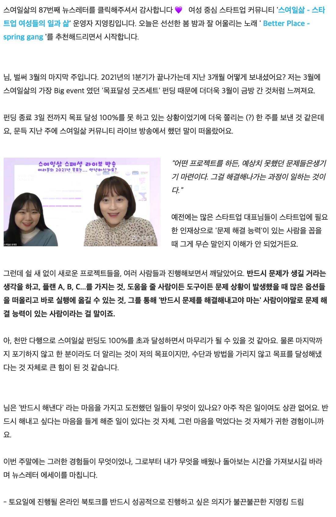 현재 우리 스여일삶은 페이스북 그룹을 중심으로, 매주 금요일에는 뉴스레터를, 얼마 전에 시작한 유튜브 채널까지 운영을 하고 있다. 가장 중요한 아이덴티티는 '커뮤니티'이기 때문에 이런 성격을 놓지 않으면서 지속 가능한 방식을 찾으려 노력하고 있다.