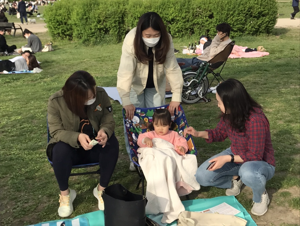 돗자리를 네 개나 펴놓고, 허리 아픈 나를 위해 친구들이 캠핑 의자도 가지고 와서는 널찍널찍 앉아서 한강 바람도 쐬고, 시답잖은 얘기들도 나눴다.