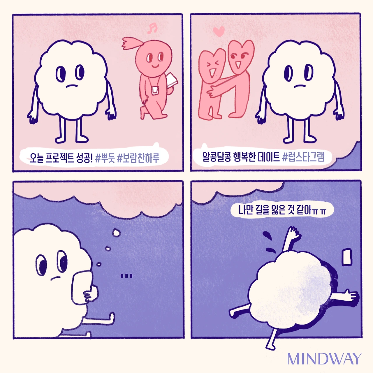 혹시 한 번이라도 ‘이렇게 사는 게 맞는 건가? 나 이렇게 살아도 되나?’ 이런 생각들이 문득문득 든다면 무언가 도움이 필요하다는 신호일 수 있으니 스스로를 돌보는 것을 1순위로 두셨으면 좋겠어요.
