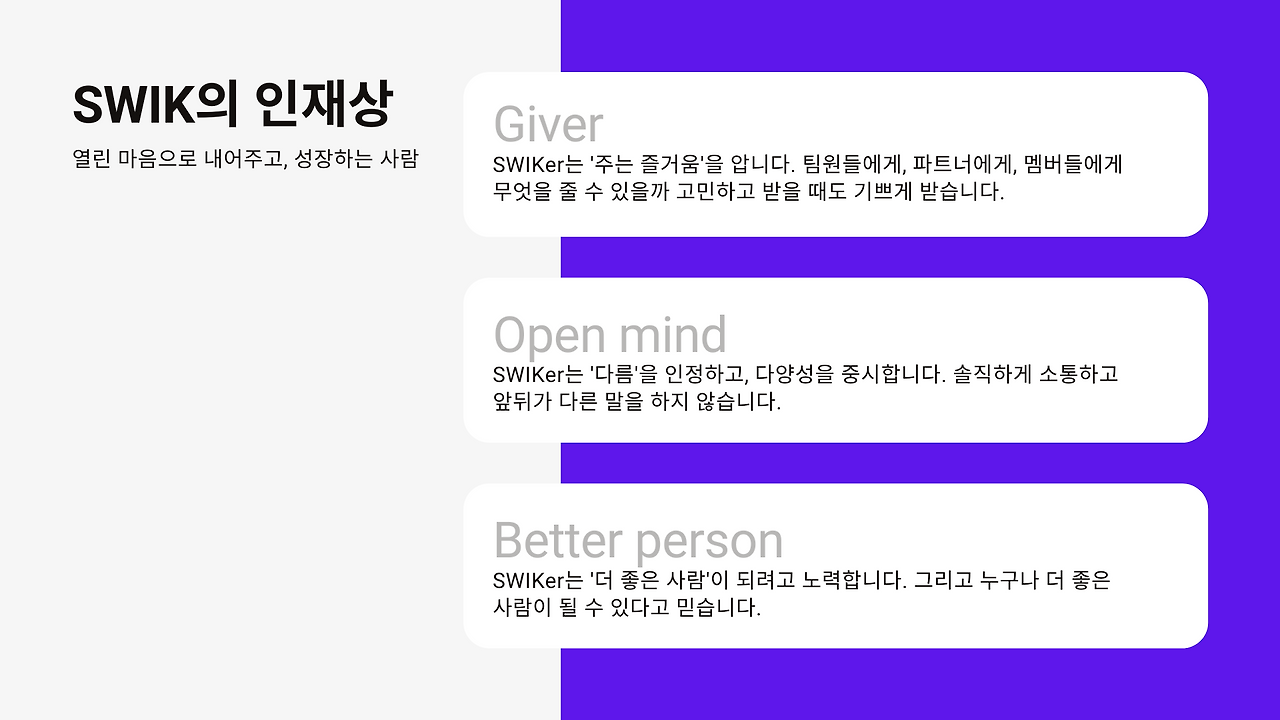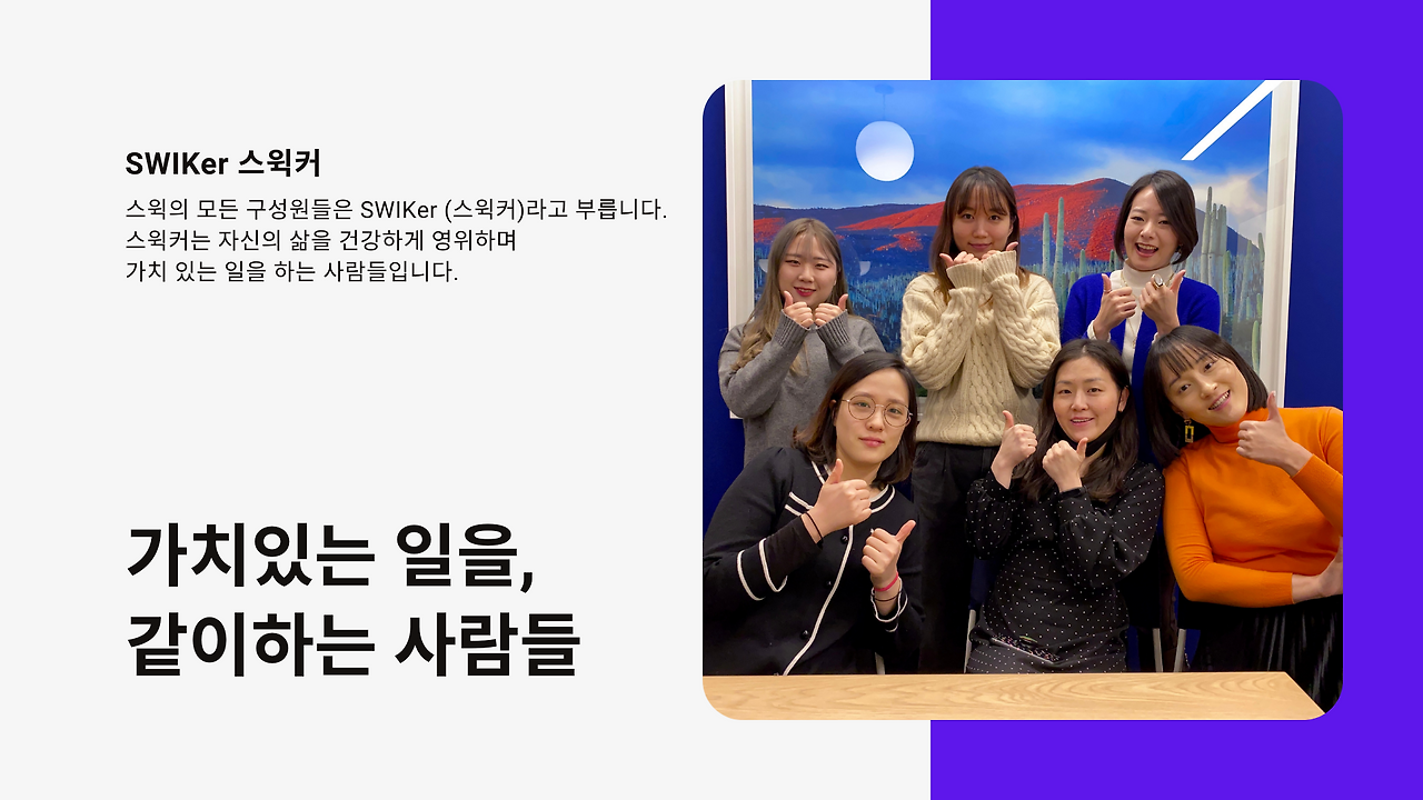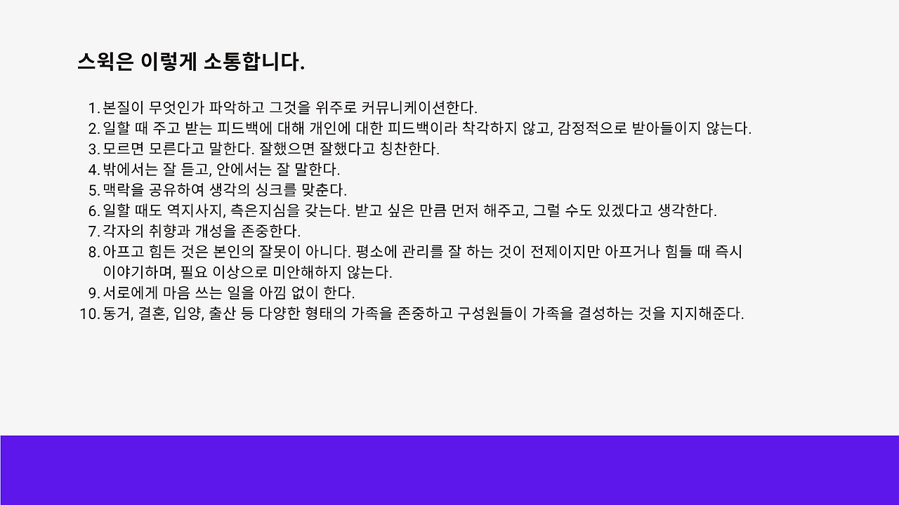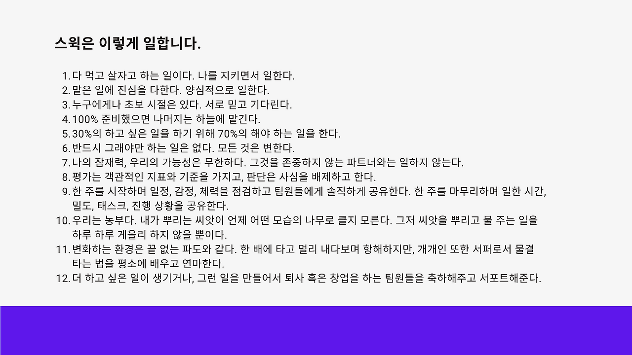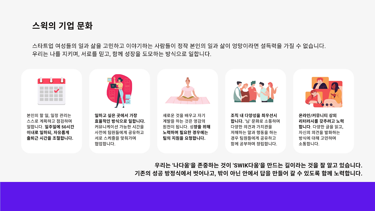 1. 스타트업 여성들의 일과 삶을 위해 커뮤니티와 컨텐츠를 만들지만 스윅에서 일하는 사람들 또한 스타트업 여성들이라고 생각합니다. 즉, 누구보다 일과 삶이 건강하고 균형 잡혀 있을 것을 우선시하고 일터에서 불필요한 감정 소모, 에너지 낭비 등은 절대 지양합니다.
