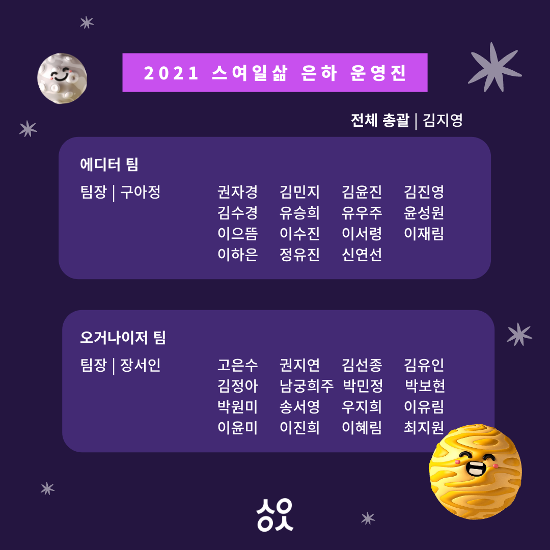 현재 스여일삶에서 진행되는 다양한 이벤트들과 스타트업 여성들의 인터뷰는 35명의 <은하 운영진>이 함께 만들어가고 있습니다.