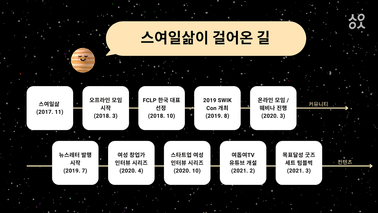 안녕하세요, 대한민국 최대 여성 중심 스타트업 커뮤니티 '스여일삶'을 운영하고 있는 스윅(SWIK)의 김지영입니다.