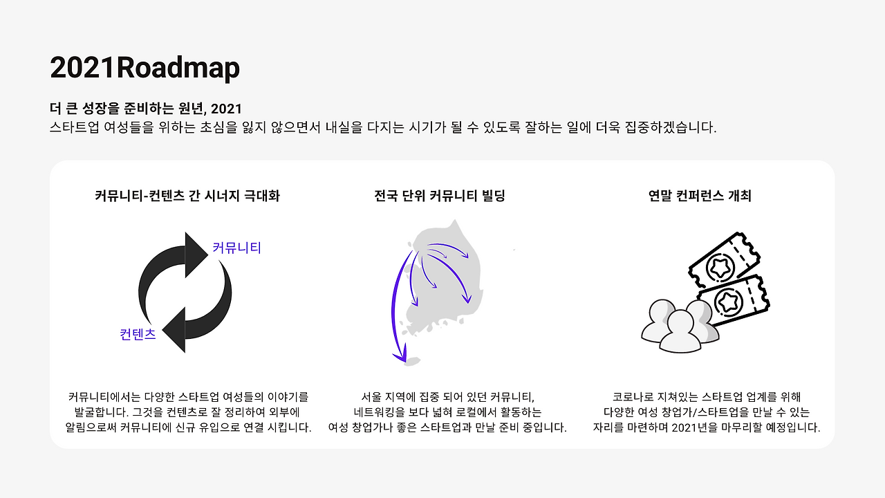 우리는 '스타트업 여성들을 연결하고 힘을 북돋아 대한민국 스타트업 생태계가 건강해지는 데 일조한다'라는 비전을 가지고, 대한민국 창업가 3명 중 최소 1명이 여성이 되는 그 날까지 사람과 사람, 사람과 스타트업, 스타트업과 스타트업을 연결하는 활동을 해나갈 것입니다. 또한, 더 많은 스타트업들이 젠더 감수성을 갖춘 기업 문화를 만들 수 있기를 바라며 스타트업 여성들의 목소리를 세상에 전하는 일을 하려고 합니다.