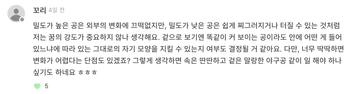 꼬리 님은 '공'에 꿈을 비유하며 결국 꿈에도 밀도가 중요한 게 아니겠냐고 말씀해주셨어요. 그러면서 속은 단단하고 겉은 말랑한 '야구공'이었으면 좋겠다는 바람도 덧붙이셨네요. 저는 이렇게 꼬리 님이 공에 비유를 해주시니 밀도는 결국 실력이나 내공이겠고, 겉 표면은 그 실력을 쌓아가는 전문성/영역 같다는 생각이 들었어요. 예컨대 '스타트업 마케팅'의 영역은 공의 표면이겠고, 그 안을 채우는 것은 매일매일 쌓아가는 내공이겠죠.