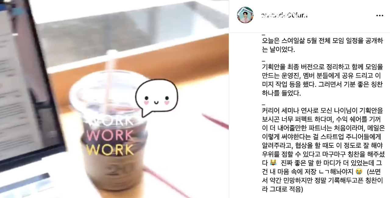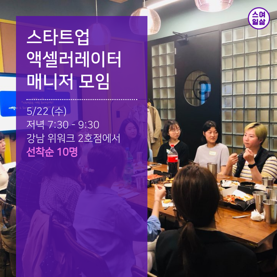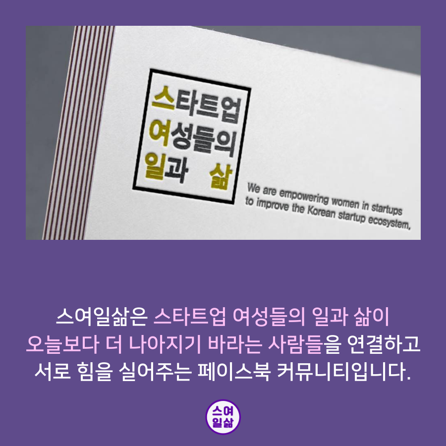 요즘 나는 스여일삶 - 스타트업 여성들의 일과 삶 이라는 커뮤니티 운영에 매진하고 있다. 원래 회사 다니면서 사이드 프로젝트로 시작했던 일인데 이제는 이것을 기반으로 더 큰 꿈을 꾸고 있는 상황이라 커뮤니티 운영에 집중하고 있다.
