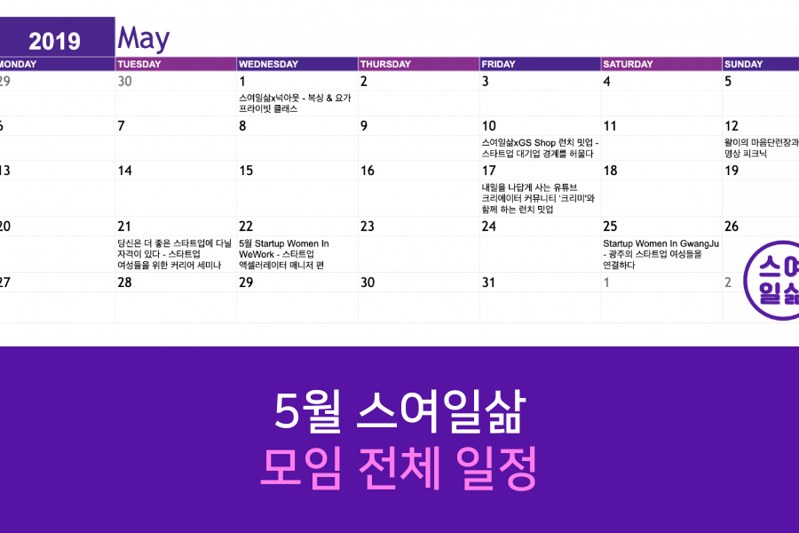 다음 주에 진행되는 두 모임(GS SHOP과 함께 하는 점심 모임 & 왈이의 마음 단련장과 함께 하는 명상 피크닉)은 커뮤니티 내에서 참가 신청을 받고 있고, 5월 전체 모임에 대해 사전에 알림 받기를 신청하신 분들께는 이메일로 따로 알람도 보내드리고 있다.