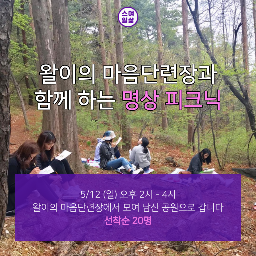 : 가만히 앉아 바람을 느끼고, 풀내음을 맡으며, 새소리에 귀 기울인 채 걷던 게 언제인지 기억이 가물가물한 스타트업 여성들을 위해 준비했습니다. 남산 공원 자락에 위치한 왈이의 마음 단련장에서 모여 명상 피크닉을 해요! 편안하게 걷고 대화하면서 나 자신에 집중하는 시간을 가집니다.