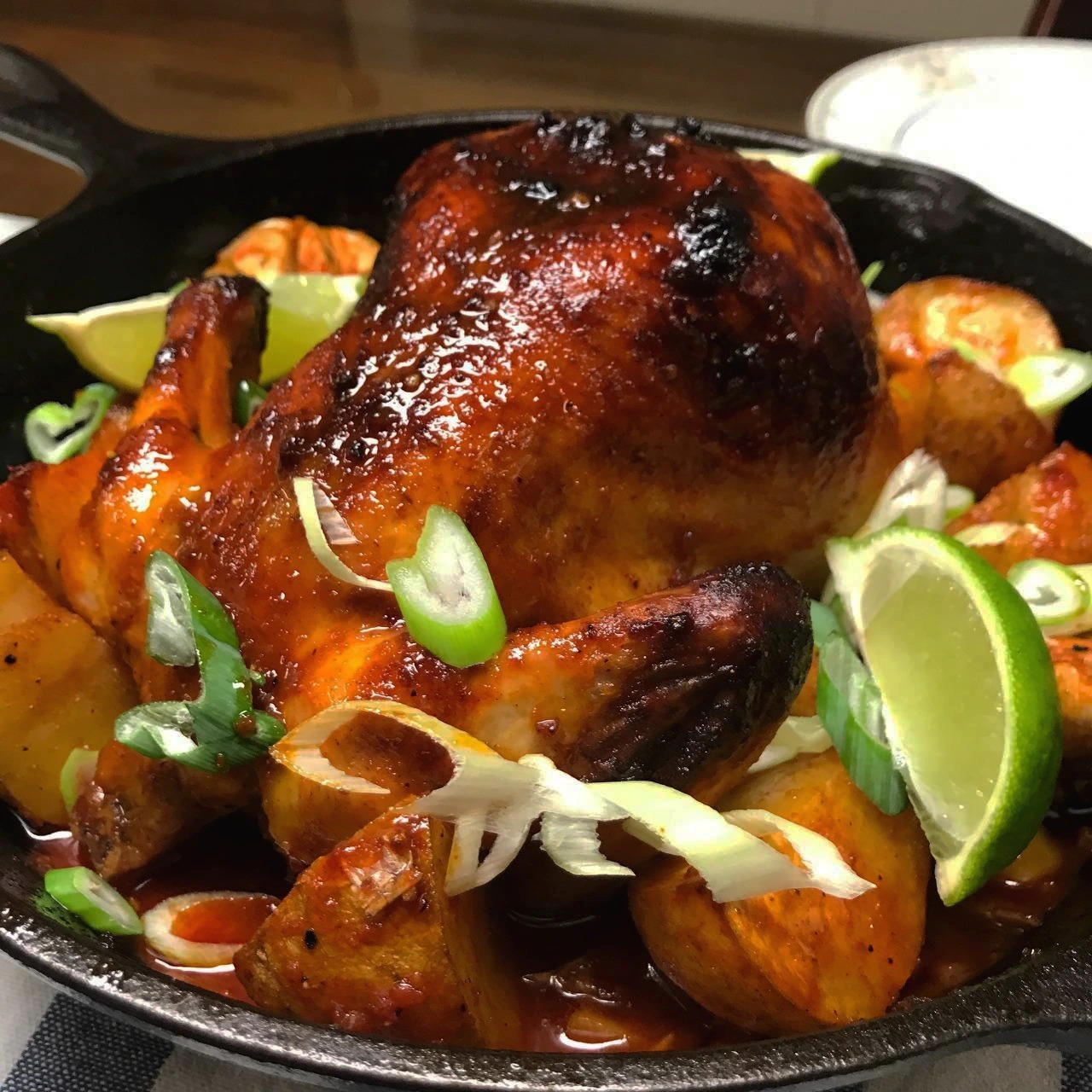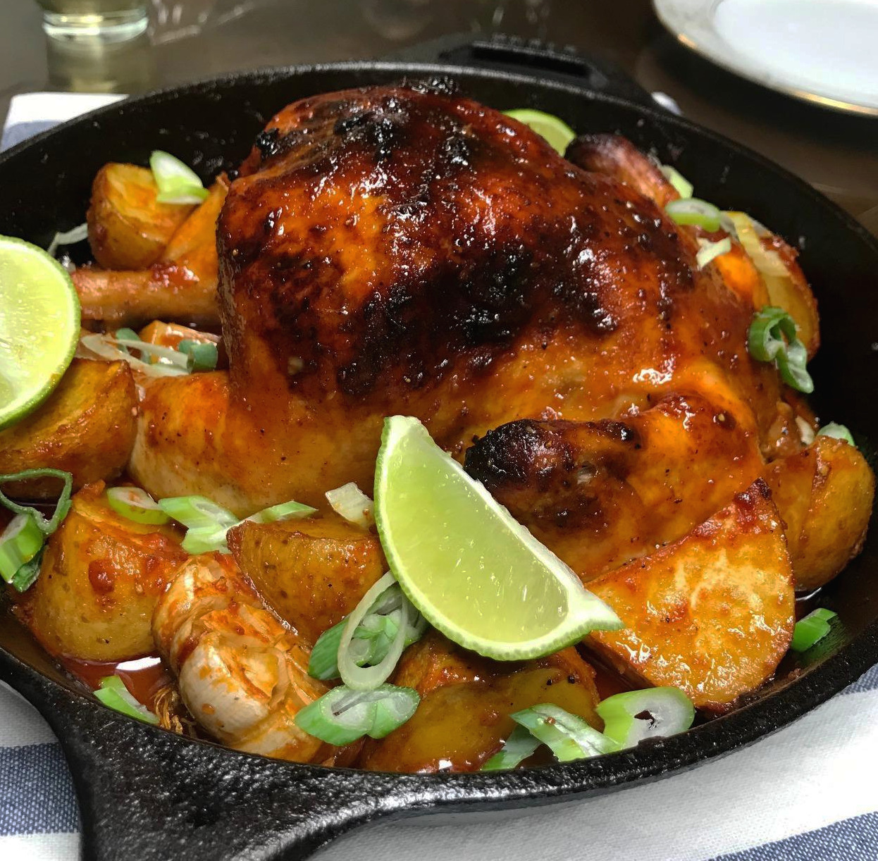 방법은 생각보다 간단합니다. 고추장에 올리브유와 마늘, 생강, 꿀을 넣어 소스를 만들고, 절반은 닭에 바르고 나머지는 곁들임 감자와 마늘에 양념해서 무쇠 팬에 담고 150℃ 오븐에서 2시간-2시간 30분 정도 오랫동안 굽습니다. 마지막으로 어슷썰기 한 대파와 라임으로 장식합니다.