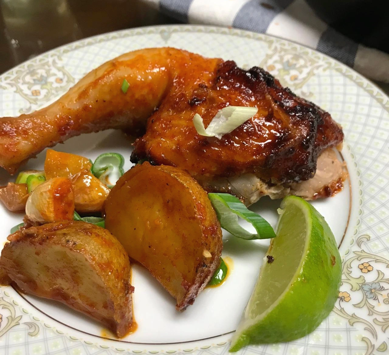 호기심 가득한 마음으로 다리살을 발라내고 감자와 마늘, 그리고 소스를 뿌리고 마지막에 라임즙을 한 바퀴 뿌려 먹었습니다. 고추장의 매콤 달콤함, 마늘과 생강의 향이 감칠맛을 돋웠습니다. 닭도 아주 부드럽고 촉촉했습니다. 이 요리를 새롭고 특별하게 만들어준 1등 공신은 바로 라임이었습니다. 향긋하고 이국적인 라임 향이 고추장의 묵직함과 닭기름과 올리브유가 섞여서 나오는 고소한 맛을 한층 살려주었습니다. 그저 익숙한 고추장 소스 닭요리(예. 닭볶음탕)가 아니라 새롭고 맛있는 요리를 먹었습니다. 친숙한 맛과 재료에서 기존에 경험해 보지 못한 새로움을 느꼈을때가 그냥 새로운 음식을 먹을 때 보다 더 강한 인상을 받게 되지요. 보통 맛있으면 식탁이 조용해지는데, 오랜만에 가족들끼리 조용하게 순식간에 다 먹었습니다.