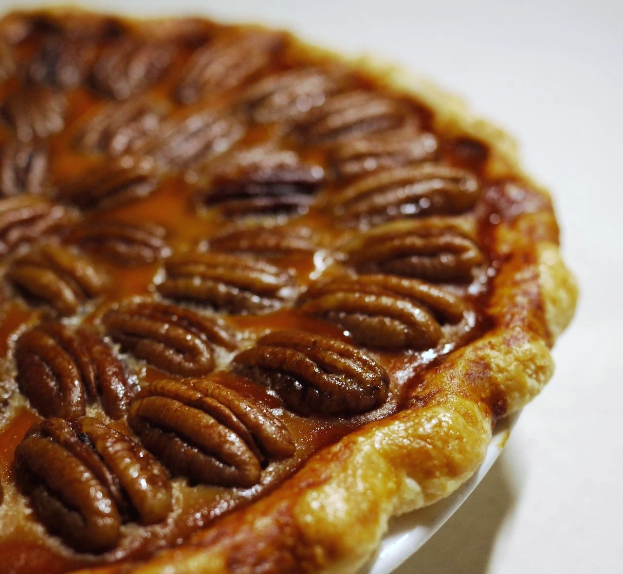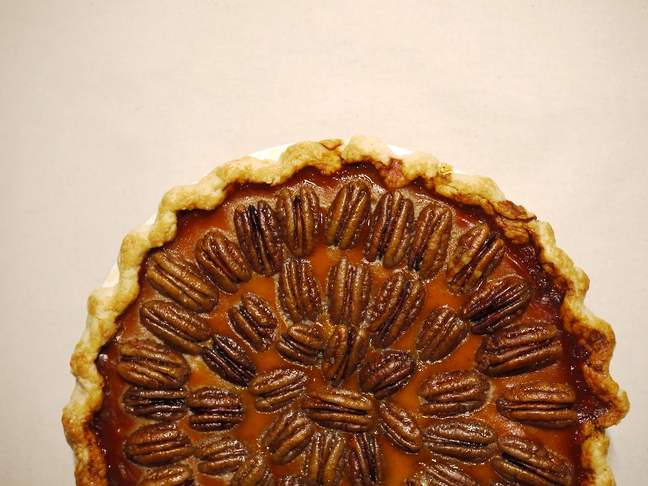 5) 40분이 지나면 파이를 꺼내 (가운데가 완전히 익지 않은 상태임) 피칸을 장식해 올린다. 그리고 다시 180도에서 10분 굽는다.