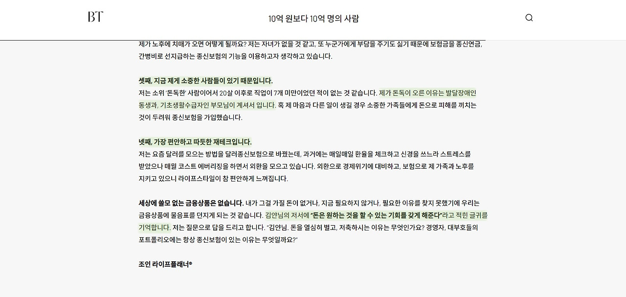 마지막으로, 가장 마음에 들었던 부분은 바로 '화법'이었다. 푸르덴셜생명의 금융 전문가들이 다양한 인터뷰이의 고민들에 대하여 조언해주는 화법은 부드럽고, 솔직하며 따뜻하다. 그들의 이야기 구석구석에는 조언의 대상을 깊이 이해하려는 모습들이 보여지는데, 특히 '김얀' 작가의 금융 고민에 대해 카운셀링하는 과정에서 그녀가 쓴 책 속의 문장을 인용하는 모습은 무척 인상적이었다.