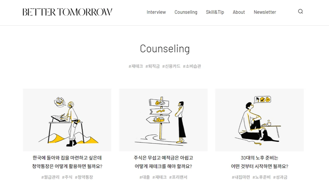 금융에 대한 사람들의 관심과 이해가 부쩍 높아진 요즈음, 어렵게만 느껴지던 금융 지식을 일상의 언어로 풀어내는 콘텐츠 또한 많아지고 있다. 그중에서도 특히 눈에 띄는 콘텐츠가 있으니, 바로 온라인 기반의 금융 라이프스타일 매거진 <Better Tomorrow>다.