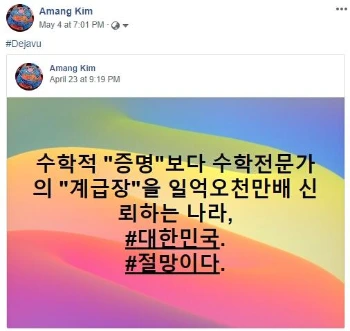 그리고, 소위 수학(통계학포함)/과학 한다고 하는 학자가 계급장을 운운하며 자신의 논리를 증명 하는건, 정말이지 쪽팔리는 일이다. 계급장 따지며 자신의 논리를 설명할 수 밖에 없는 그런 이가 만약 한국 통계학회 회장이었다면, 한국통계학회 전체가 쪽팔릴 일이고, 그런 이가 서울대 통계학과 교수였다면, 서울대 통계학과 전체가 쪽팔릴 일이다.