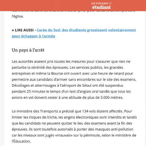 장황하게 서두를 시작한 이유는, 다음 주에 있을 대학 수학능력시험 때문이다. 프랑스어권 매체도 한국의 유별난 교육열, 그리고 그 정점에 있는 대학 입시, a.k.a 수능에 관심이 많다. 여러 프랑스어권 언론에 수능 시험 날에는 출근도 늦게 하고, 심지어 영어 듣기 시간에는 비행기도 뜨지 않는다는 기사가 실린 것을 보고 깜짝 놀랐다. 굳이 수능과 대학 입시의 중요성을 말하지 않아도 한국 사람이면 누구나 그 중요성을 십분 공감할 수 있다. 최근 강남의 어느 아파트 단지에서는 코로나 때문에 집에서 공부하는 고3 학생들을 위해 수능 시험 날까지 인테리어 공사를 금지한다는 공지가 걸렸다는 기사를 보았는데 보통 찬반 입장이 갈려 극렬하게 싸우는 댓글란에서 보기 드물게 아파트 입장을 이해한다는 의견으로 대동단결 했을 정도니까. 실제로 나도 수능생을 위한 극진한 배려를 직접 경험한 적이 있었다. 수능 보러 가는 길에 엄마가 차로 데려다주면서 급한 마음에 다른 차를 받았는데 수능 보러 간다고 하니까 연락처만 받고 정말 바로 보내줬었다. 어쨌든 수능 날이 되면 온 나라가 수능에 올인한다고 해도 과언이 아니다. 그리고 이러한 유별남은 해외에까지도 정평이 나있다.