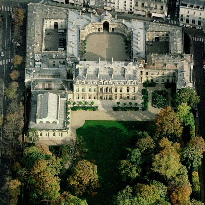 엘리제 궁 항공샷. 현관과 쿠르 도뇌르, 정원이 한 축에 있는 것을 볼 수 있다. Patrick Durand/Sygma via Getty Images