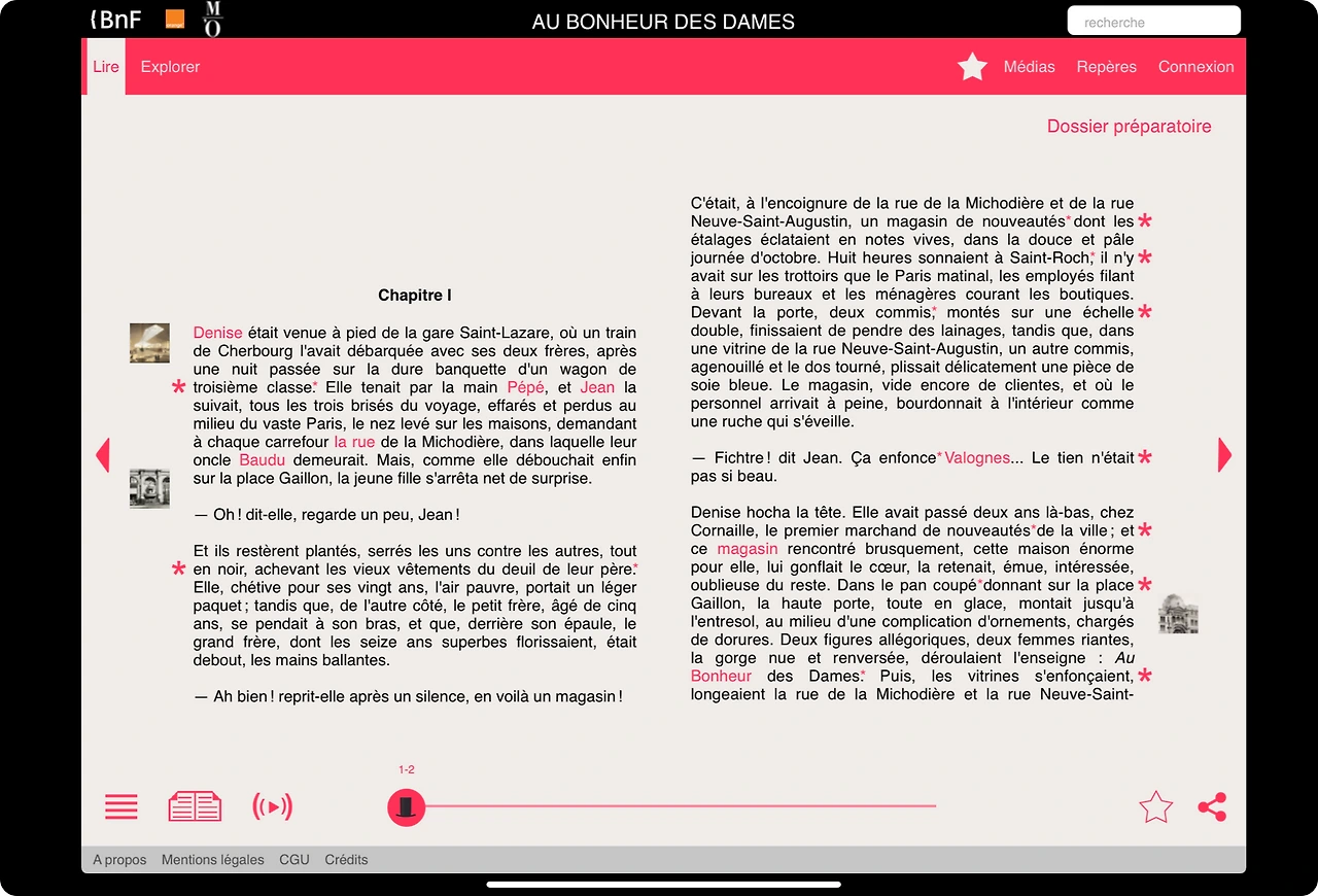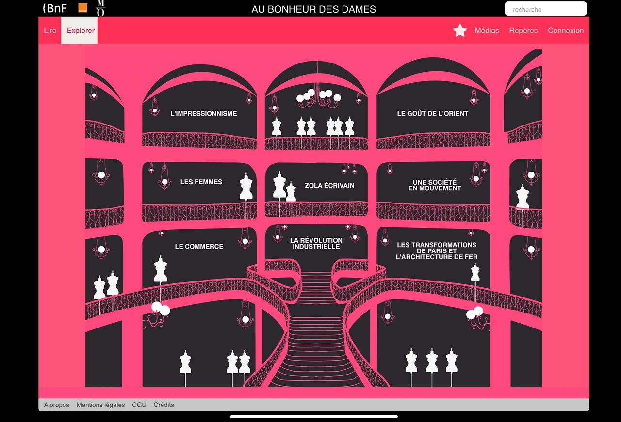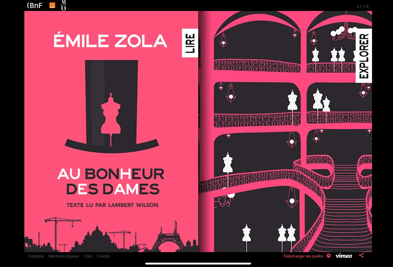 BnF에서 만든 Au Bonheur des dames e-book. 나는 아이패드 앱으로 받았는데 인터넷으로도 볼 수 있다. 소설을 읽을 수도 있고 관련 테마(졸라, 산업혁명, 상업 등)에 대해 더 자세히 공부할 수도 있다.