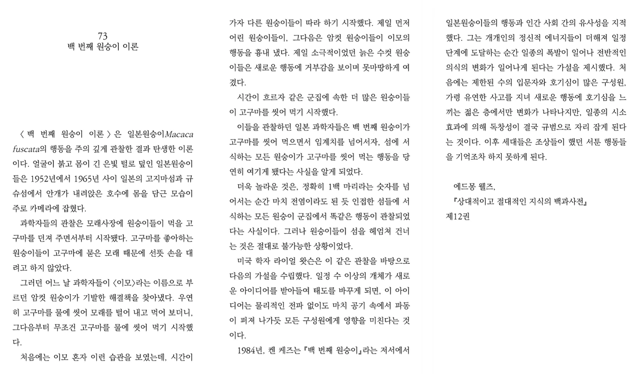 나영 : 그리고 베르나르 소설에 늘 <상대적이고 절대적인 지식의 백과사전>이 나오잖아요. 거기에 <백번째 원숭이 이론>이라는게 나오더라구요. 그래서 이걸 같이 읽어보고 싶다는 생각을 했어요. 누군가 처음 무슨 행동을 하면 되게 이상한 행동이거든요. 근데 이런 행동이 점점 많아지면, 정말 습관처럼 다 퍼지게 되서 이게 왜 이렇게 되었는지 인지조차 못하면서 다 그렇게 하게된다는 내용인데, 마음을 자극했어요.