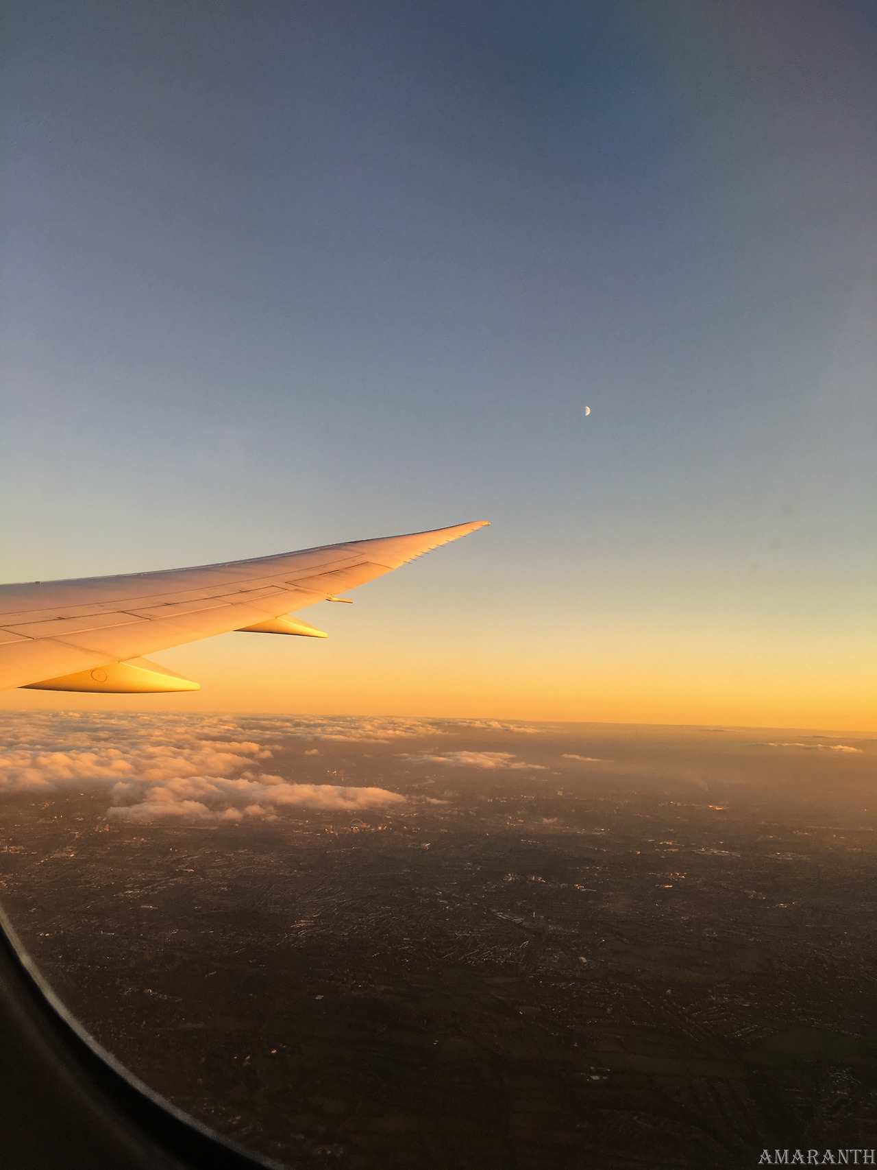 여태 그런 적이 없었던 비행기는 5시간이나 지연이 되어 나를 런던에 오래도록 묶어두었고, 덕분에 이륙 후 무지갯빛으로 물든 멋진 하늘을 바라볼 수 있었다. 내일은 무지개가 뜰 거라고 했던 플랏 메이트가 말한 그대로 말이다.