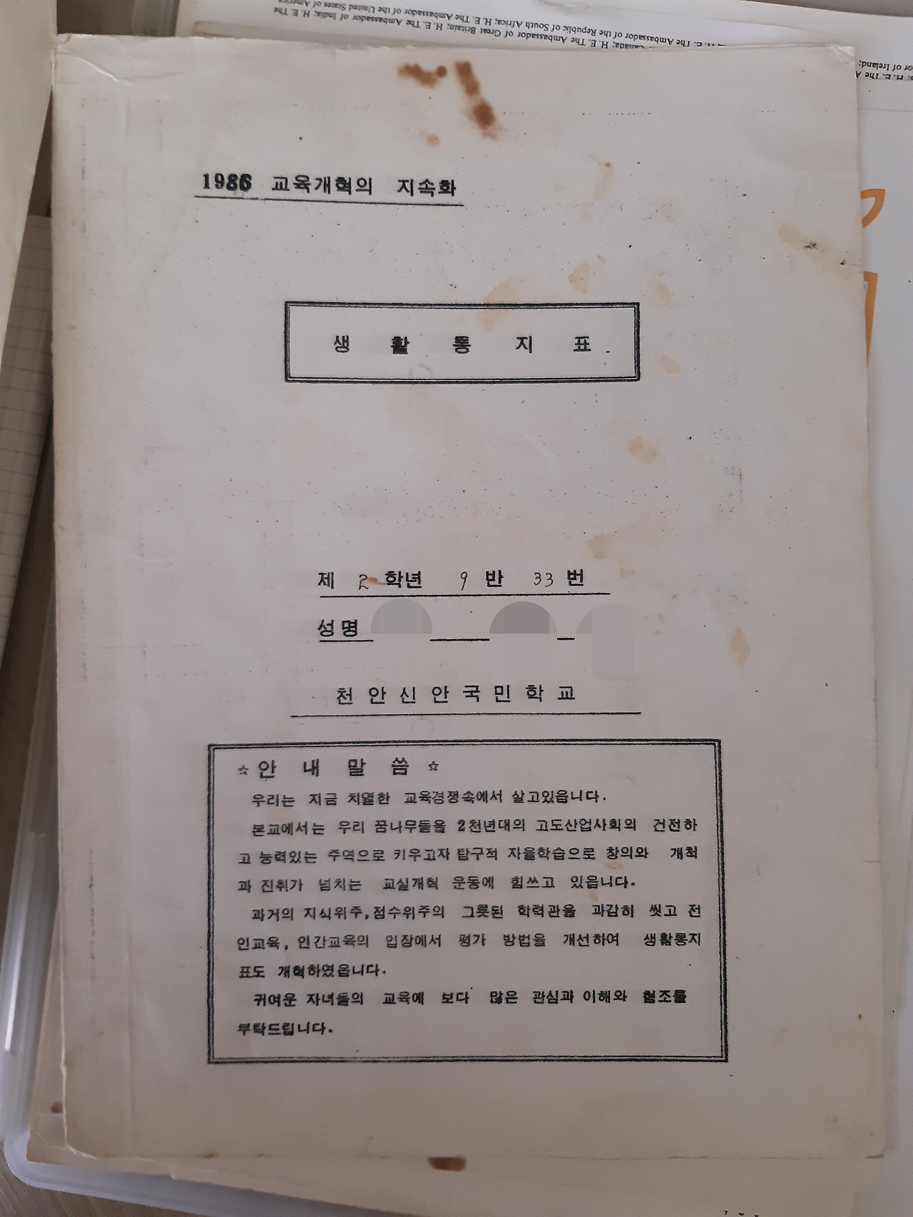 서랍에서 1986년 국민학교 성적표를 꺼내 보았다. 표지의 안내문에는 이렇게 적혀 있었다.