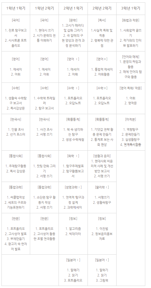 과제형: 탐구보고서, 조사활동, 독서감상문, 서평, 에세이, 포트폴리오 등(국어, 수학, 과학, 사회)