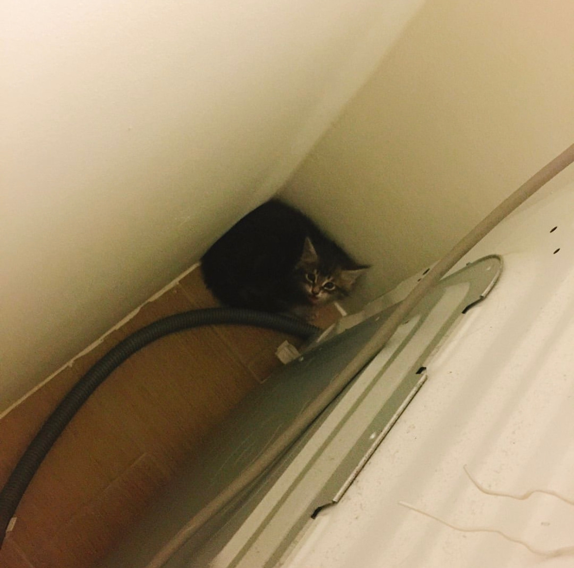 혼란스러운 마음으로 바닥에 주저앉아 아직 오지 않은 남편에게 카톡을 보내고 있는데, 어디선가 '삐용' 아주 작은 소리가 들린 것 같았다! 부엌과 다용도실 쪽인 것 같았는데 아무리 모든 문을 열고 닫아도 보이지 않던 차에, 혹시...?하고 세탁기 근처로 가자 조금 더 정확하게 '삐용' 소리가 들렸다. 작은 키로 까치발을 해서 세탁기와 벽면 사이 틈을 보니 작고 검은 형체가 보였다. 정말 작은 틈인데 저길 어떻게 들어갔는지! 고양이 액체설 말로만 들었지만 이 정도로 모든 곳에 들어갈 수 있을 줄은 몰랐다.
