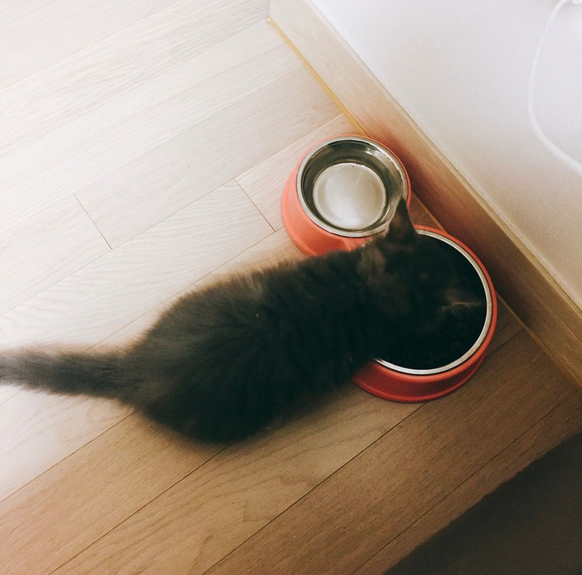 기다리다 지친 남편은 먼저 자러 들어가고, 올빼미인 나 혼자 어두운 거실에서 티비를 보고 있는데, 작고 검은 그림자가 움직이는게 보였다! 외마디 비명을 지를 뻔 한걸 어렵게 참으며 작은 털뭉치가 물을 촙촙 마시는 소리에 귀를 기울였다. 그 작은 소리가 얼마나 마음을 몽글몽글하게 해 주던지.
