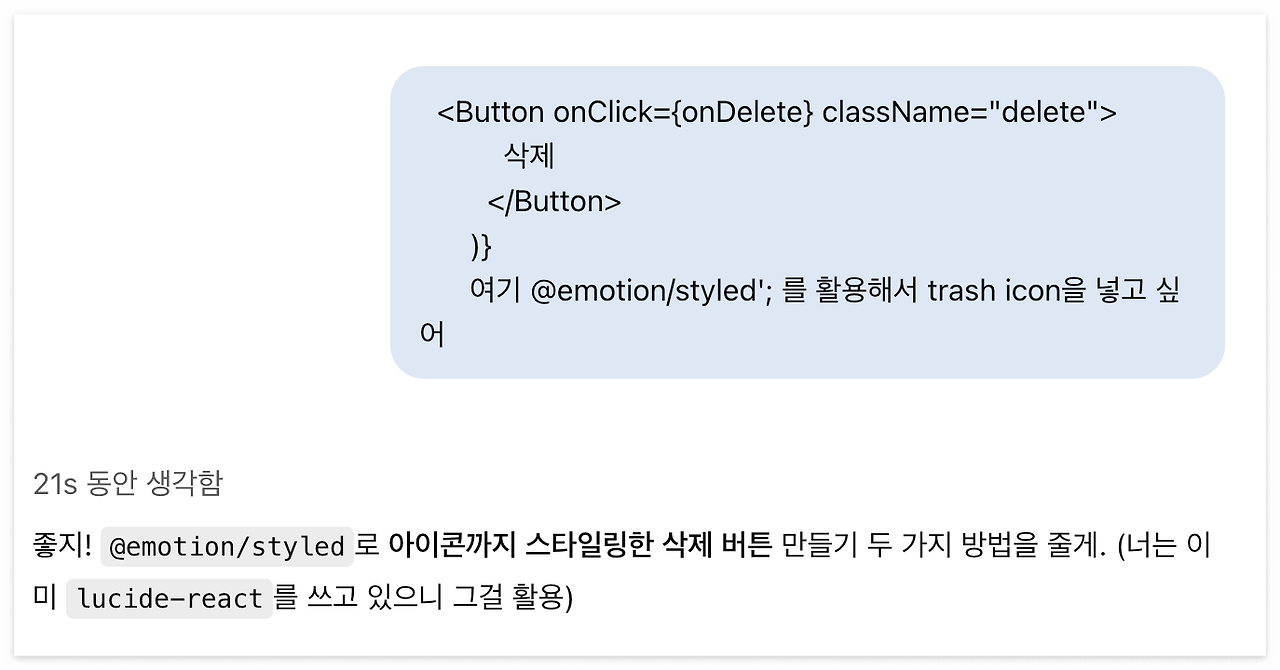버튼 디자인을 리액트 소스를 붙여서 수정할 부분과 함께 프롬프트로 요청하였습니다.