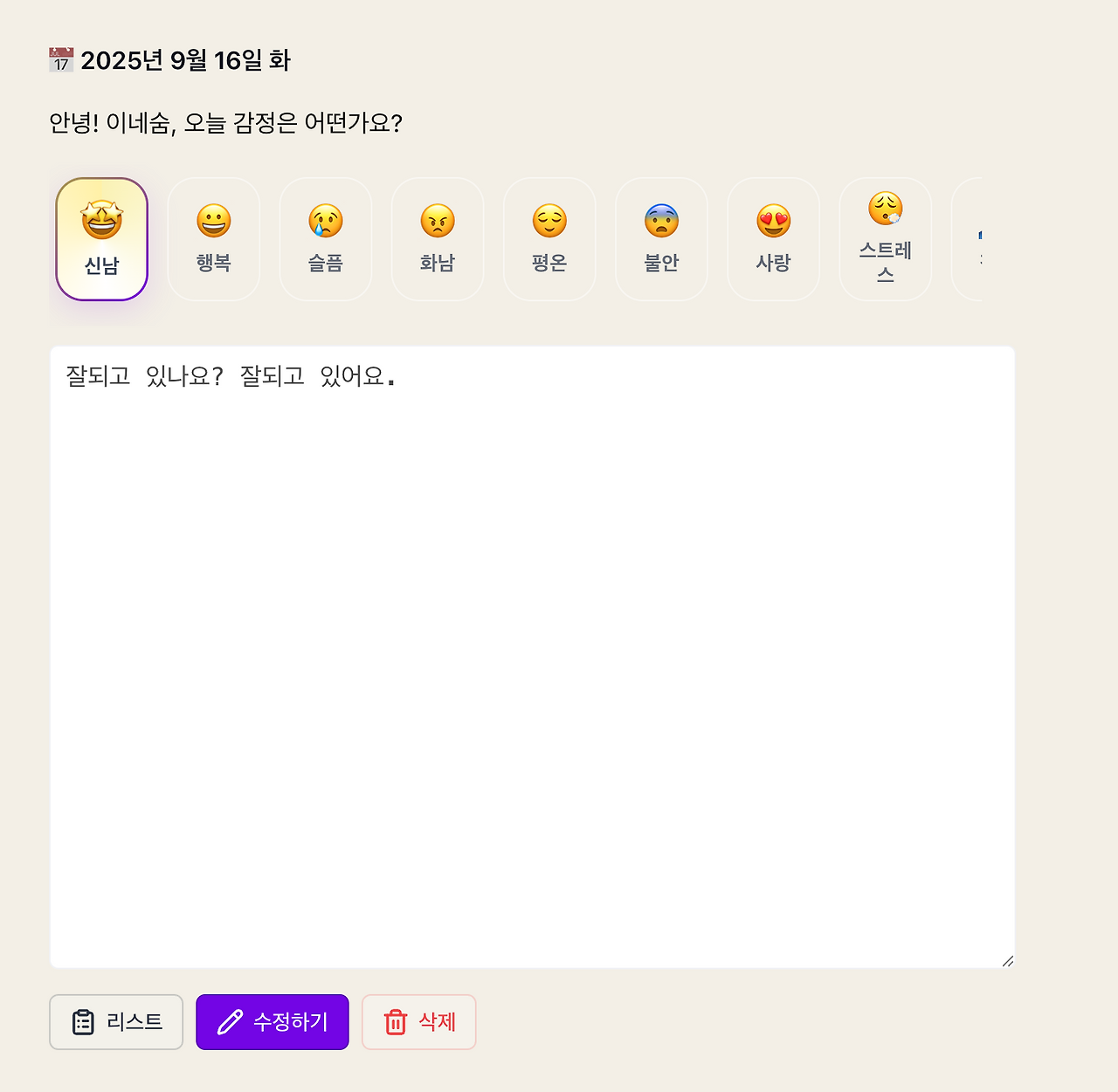 리스트에 감정 라벨(� 행복 등) 표시 확인
