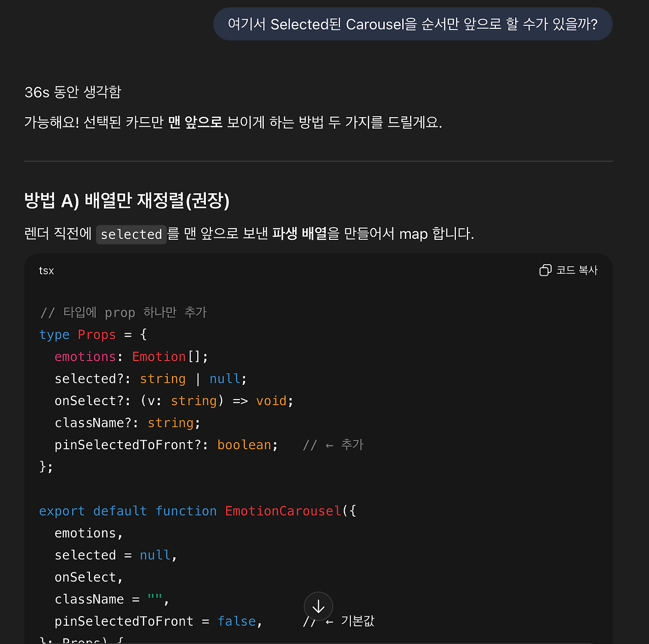 맨 앞에 나오도록 했어요! 선택된 순서를 앞으로 할 수 있는지 물어보니 ChatGPT가 해당 소스를 알려줍니다.