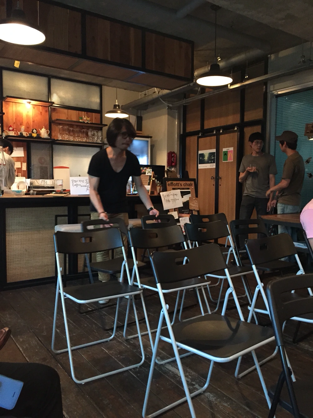 공연을 앞두고 의자를 새로 배치하시는 사장님.