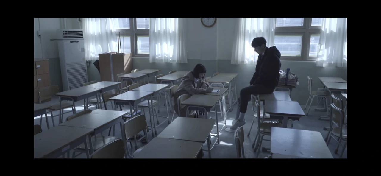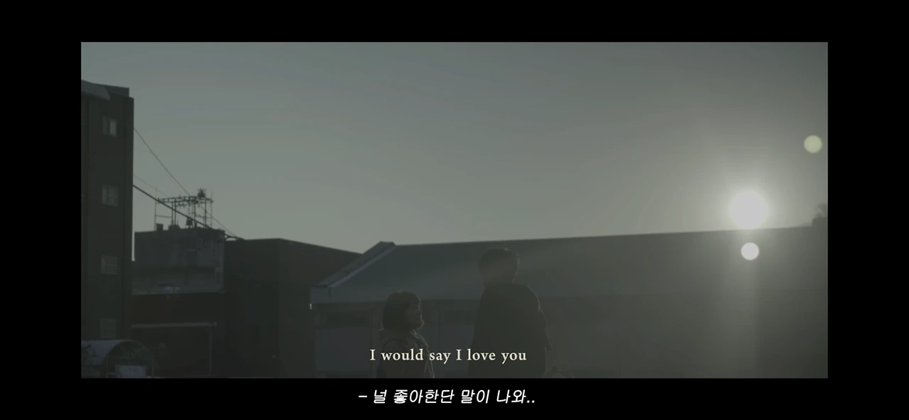 뮤직비디오에서 제일 좋아하는 장면. 일본 청춘 영화 느낌이 나는 뿌옇고 흐린 색감에 굴림체로 쓰인 자막이 너무 예쁘다.