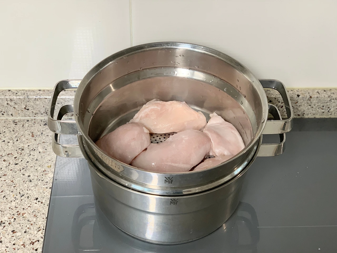 1 닭가슴살은 깨끗이 씻어 찜기에 찐다. 완전히 익히지 않아도 좋다.