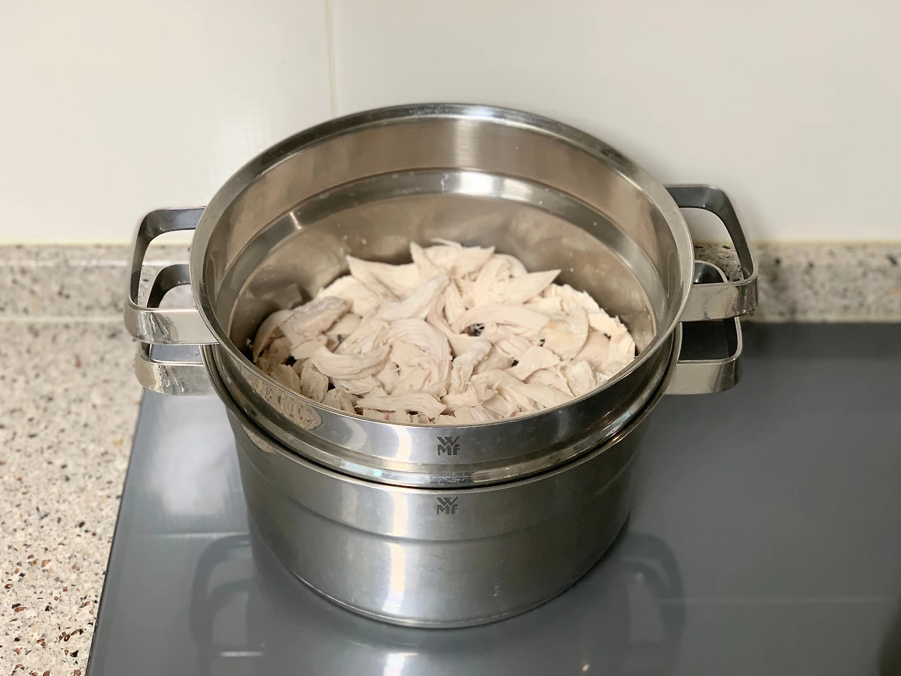 2 찐 닭가슴살은 식혀서 먹기 좋게 찢는다