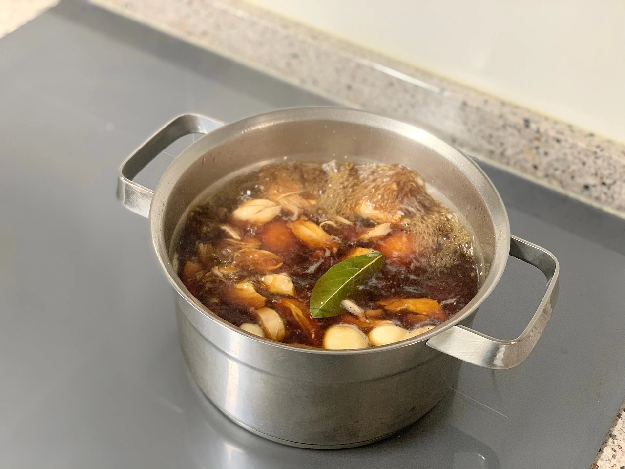 3 냄비에 양조간장, 국간장 조금, 물, 설탕, 마늘, 월계수 잎, 통후추를 넣고 끓인 후 찢어놓은 닭가슴살과 삶은 계란을 넣고 조린다.(닭가슴살 5조각, 계란 6개, 물 800ml, 양조간장 100ml, 국간장 조금)
