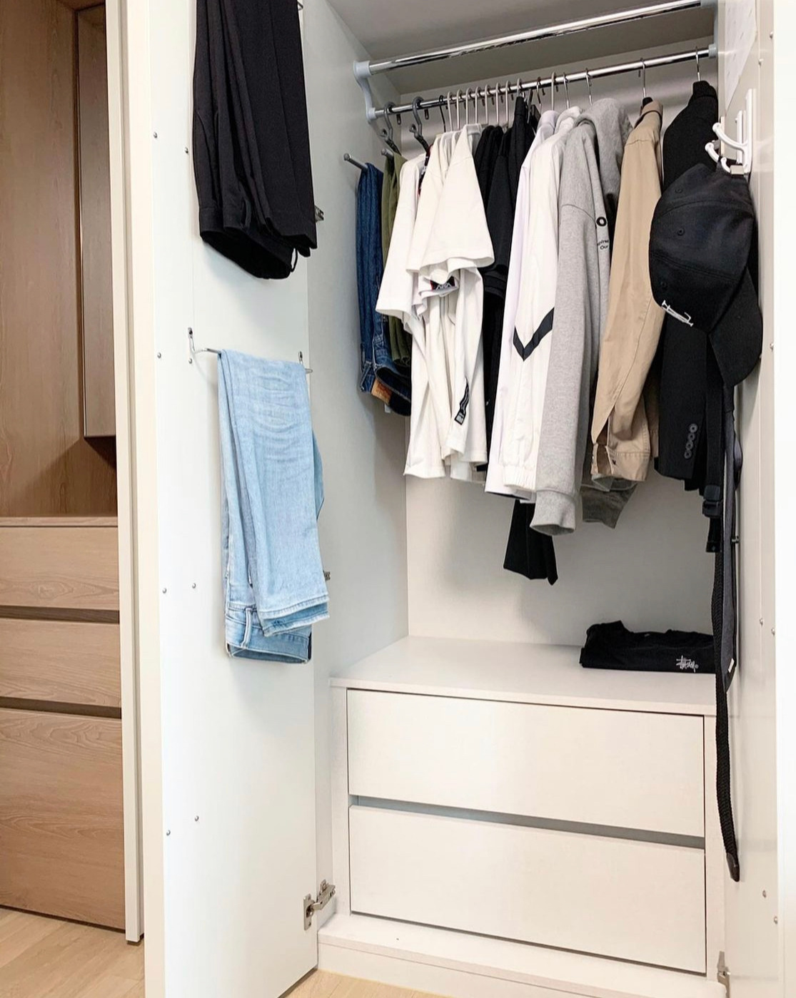 계절 옷을 박스나 보이지 않는 곳에 수납하지 않고 한눈에 찾기 쉬운 정도면 좋다.