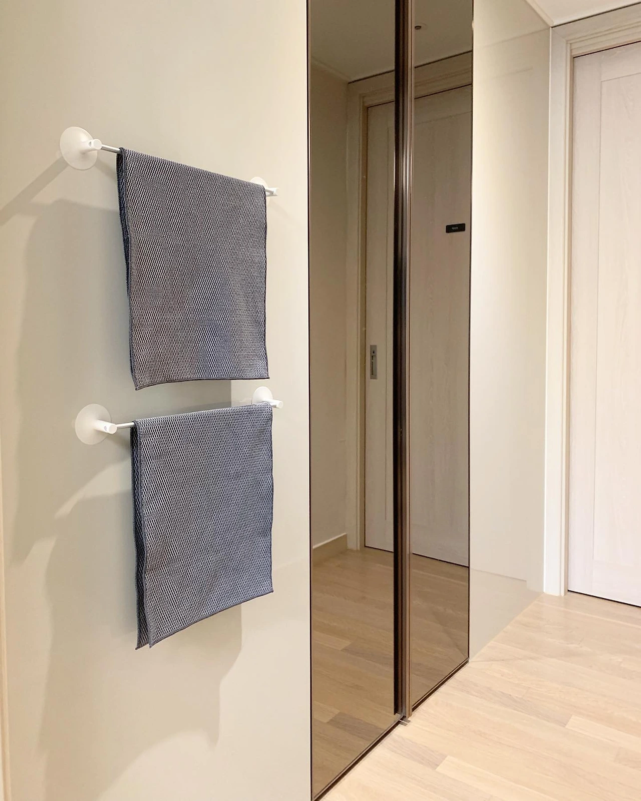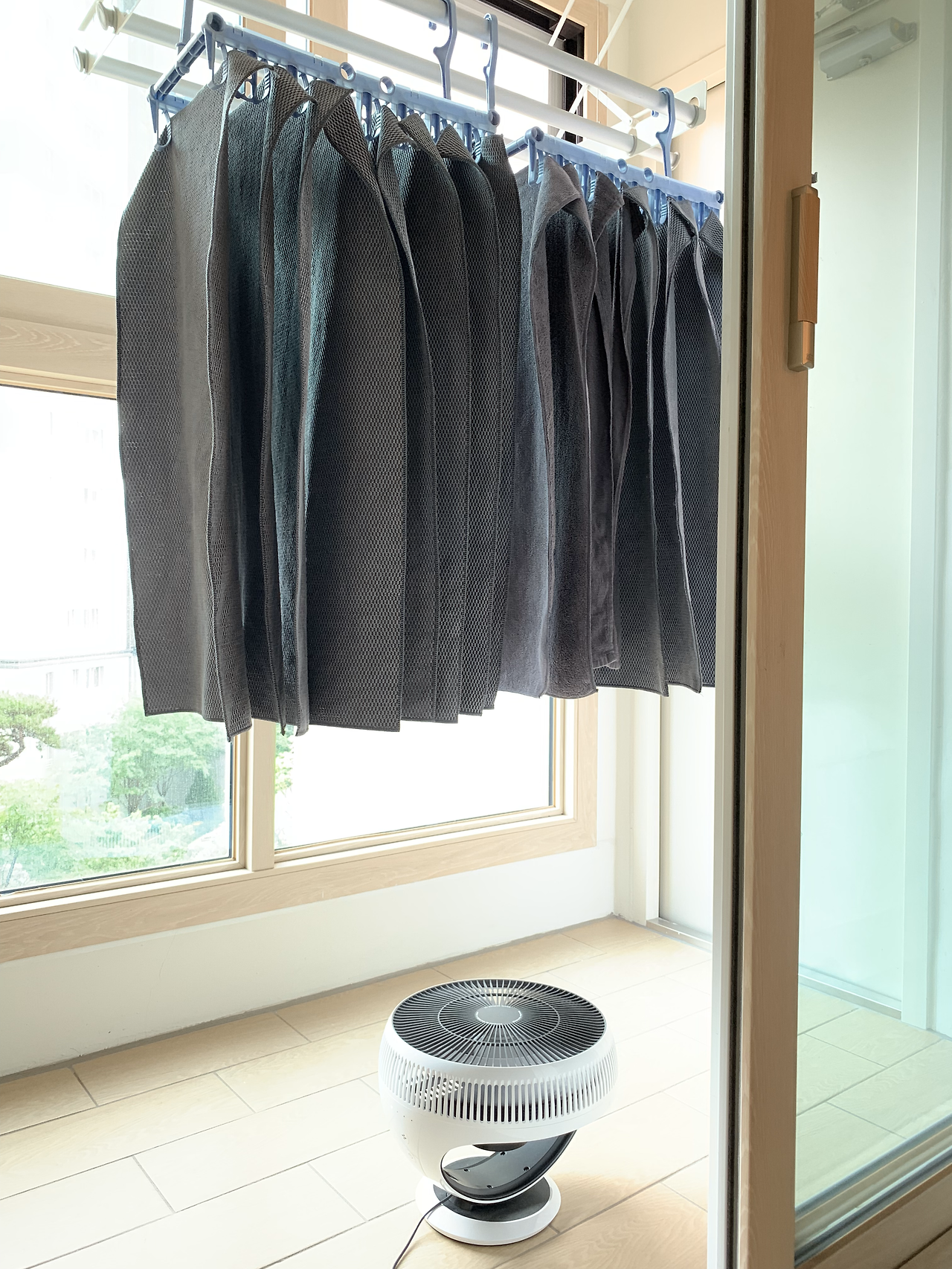 개인이 쓰는 수건은 사용 후 제대로 건조하면 이틀 이상 사용이 가능하다. 하루에도 여러 장 꺼내던 습관성 수건 교체가 사라졌다.