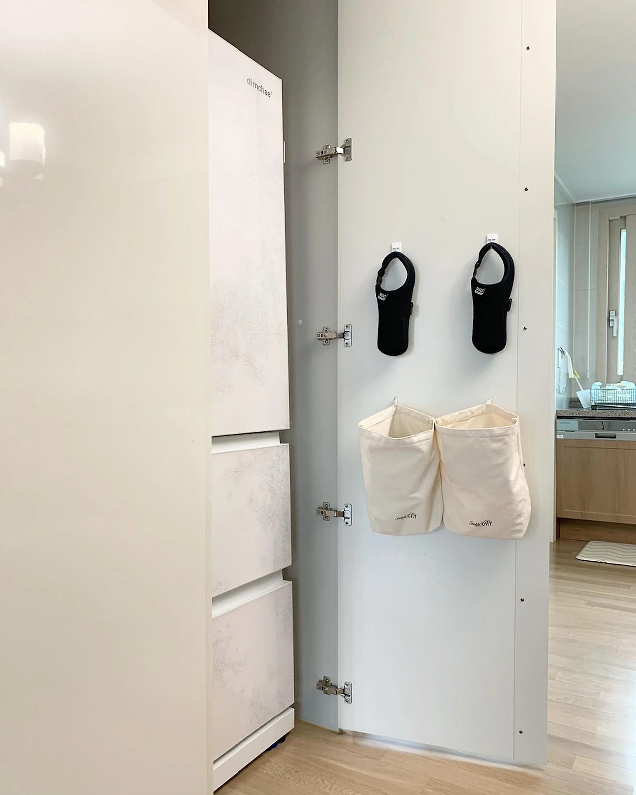 고리를 단 에코백 두개를 바느질로 연결해 주었더니 꽤 괜찮은 수납공간이 되었다.