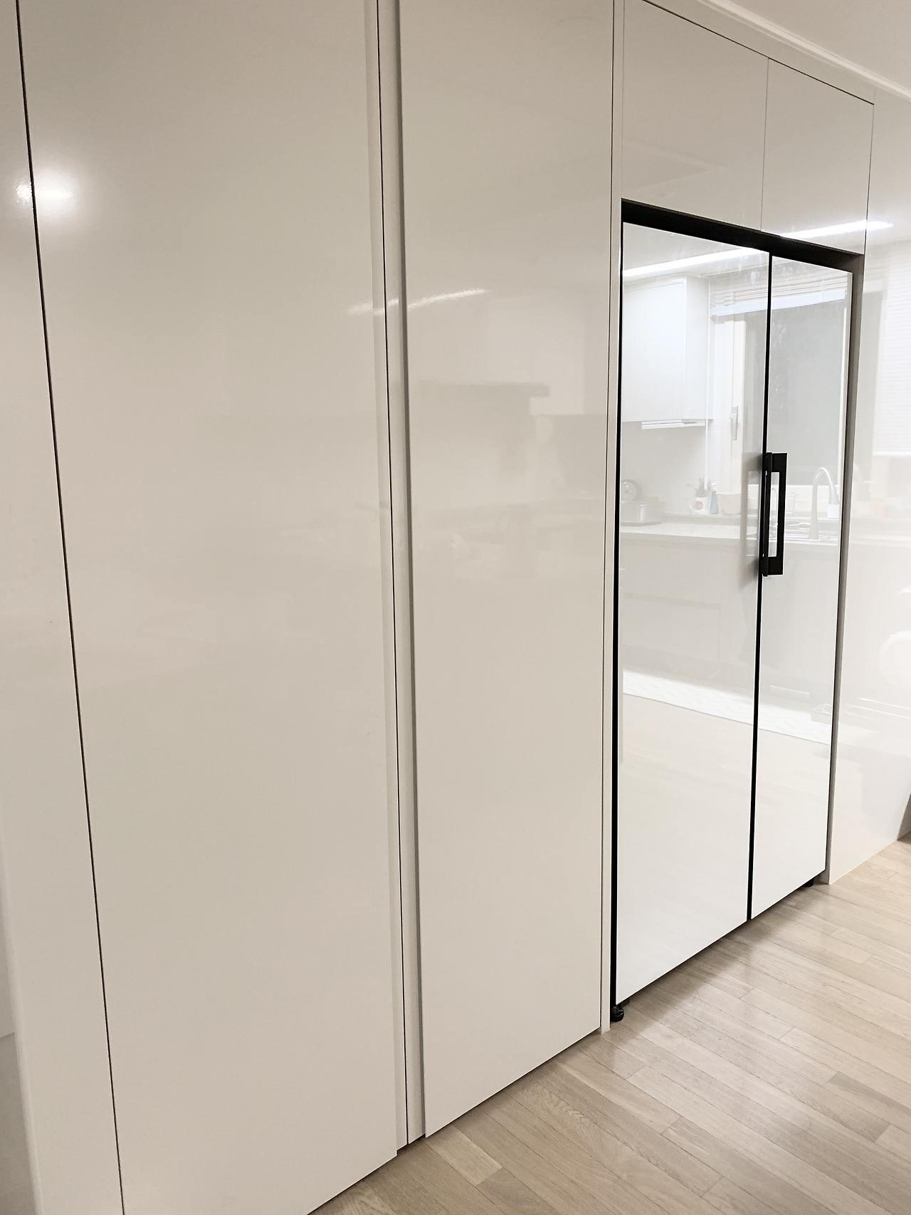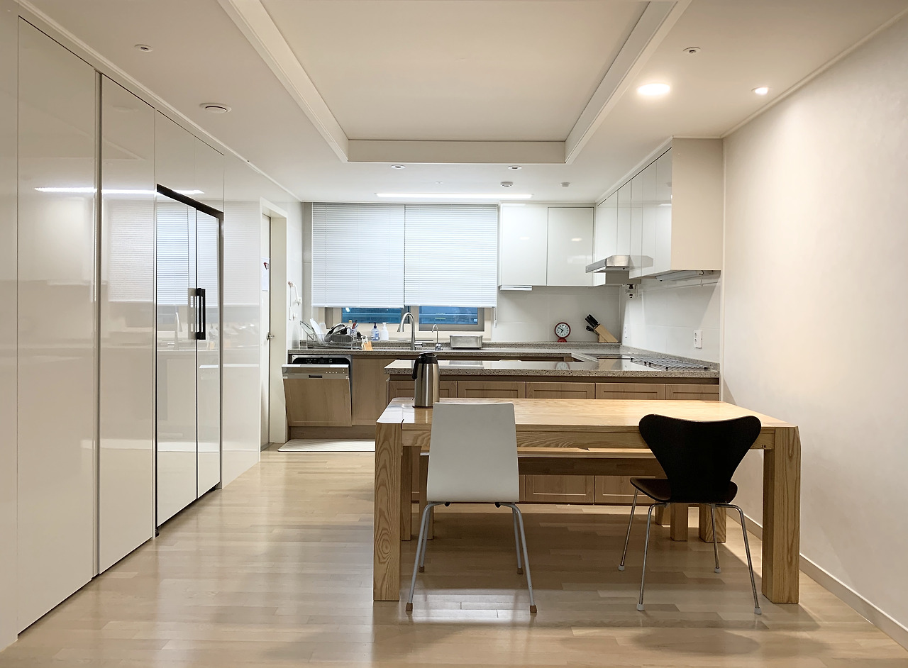김치냉장고가 수납장 안에 있으면 두 번 문을 여는 수고를 해야 한다. 하지만 그대로 둔다면 훨씬 미니멀해 보이는 효과가 있다.