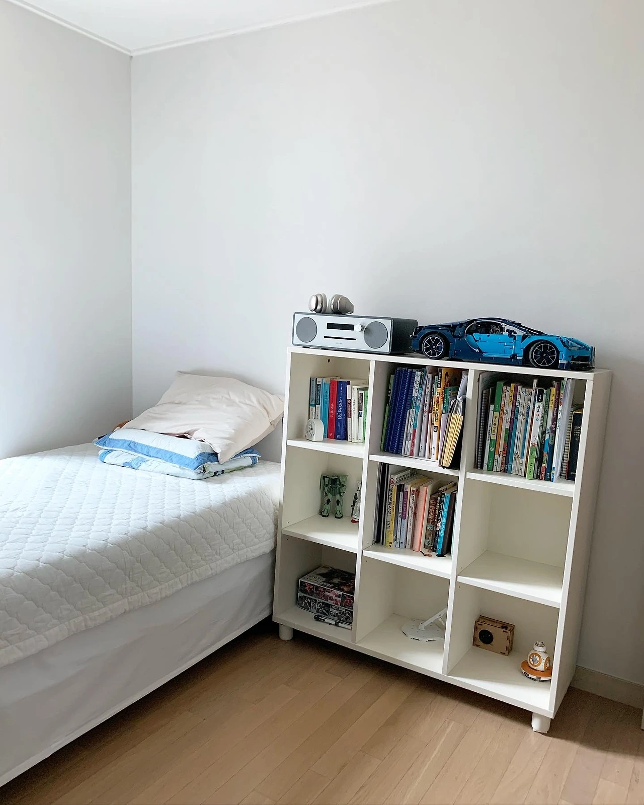 아이방 인테리어에서 가장 쉬운 방법은 방문을 열었을 때 자잘한 수납이 보이지 않도록 하는 것이다. 책장의 정면이 바로 보이지 않게 배치한다.